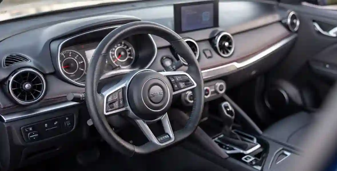 Простенькая конструкция и незамысловатый внешний вид органично сосуществуют с отделкой интерьера. Компактный DFSK полагается на разнофактурный жёсткий пластик, мягкие накладки в местах контакта и яркие акценты в отделке. Хватает и ставших фирменными для марки отсылок к премиальным брендам из Европы: можно найти «оммажи» на Mercedes-Benz, Porsche и Audi — например, в дизайне рулевого колеса, дефлекторов вентиляции, ключа-брелока, а также во взаимном расположении отдельных элементов салона.